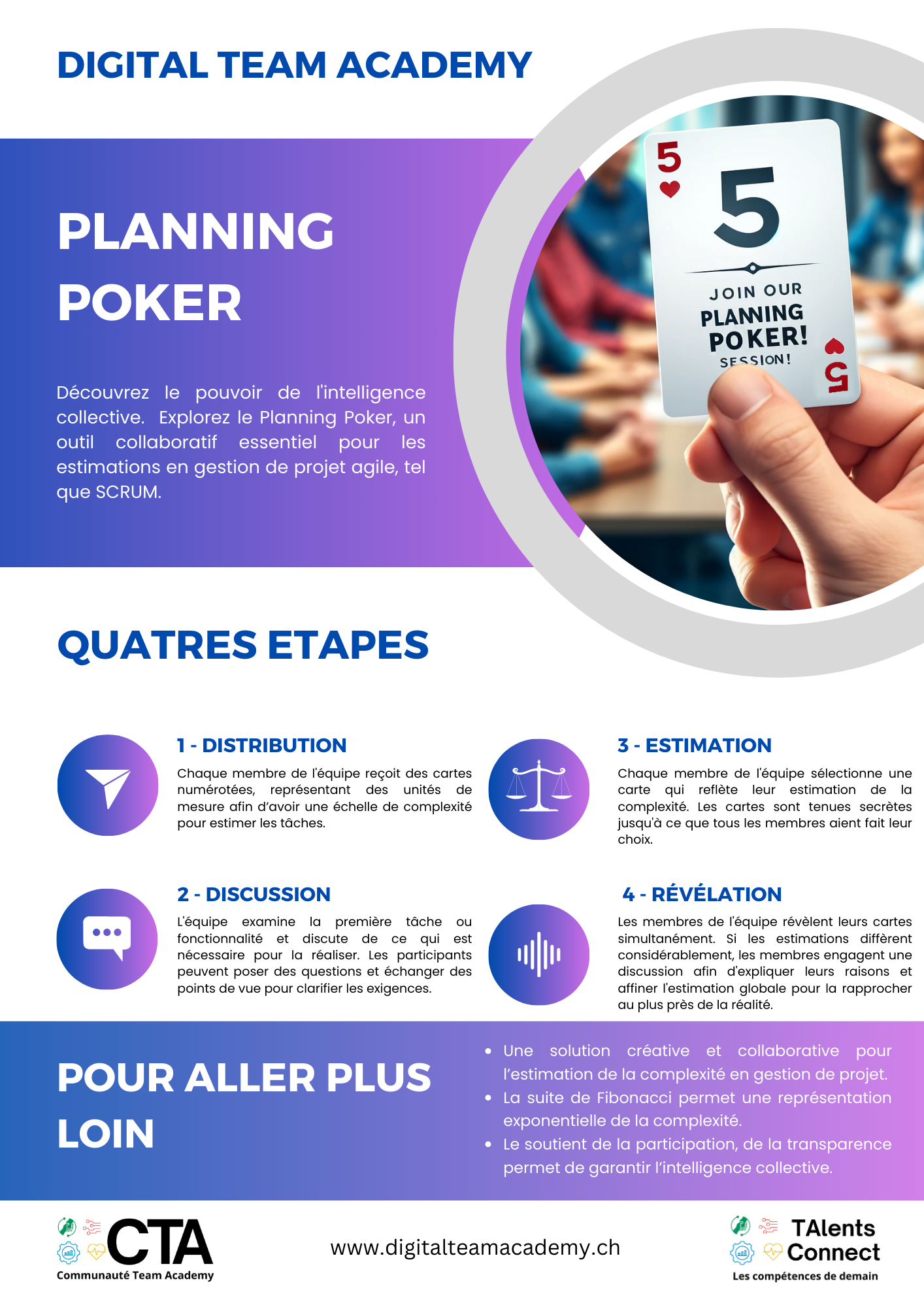 Avec un camarade, j'ai crée un workshop sur le thème du planning poker, une technique de scrum pour estimer les story points des tâches. Nous avons préparé une présentation interactive pour expliquer le concept et les règles du jeu, puis nous avons organisé une session de planning poker avec les participants pour les familiariser avec la méthode. Cette expérience m'a permis de renforcer mes compétences en gestion de projet agile, en facilitant la compréhension et l'application pratique des concepts de scrum. mais, j'ai essayé de casser les codes en l'utilisant pour des RH.
