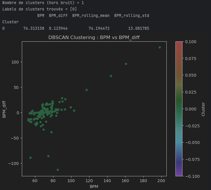 Je pense que ce modèle utilisant DBSCAN est bien adapté pour explorer les données BPM de mon Apple Watch. Contrairement à K-Means, il détecte des clusters de formes arbitraires et identifie les points isolés comme du bruit, ce qui convient bien aux données biométriques souvent hétérogènes.