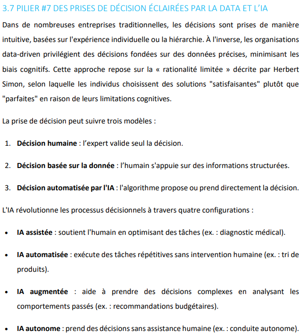 LI 3 : Le pilier 7 insiste sur la prise de décision éclairée par l'IA et le rôle central des algorithmes dans l’optimisation des processus et la personnalisation des offres. Cette lecture aide à comprendre comment l'IA améliore les performances des systèmes d’information en automatisant des tâches complexes et en réduisant les biais décisionnels.
