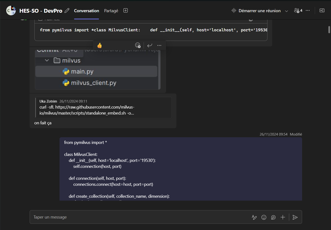 - Mardi : journée dédiée à DevPro, avec des réunions pour organiser le sprint, présenter les outils technologiques et résoudre ensemble des problématiques techniques, telles que l'intégration des embeddings et la gestion des erreurs sur l'API OpenAI.