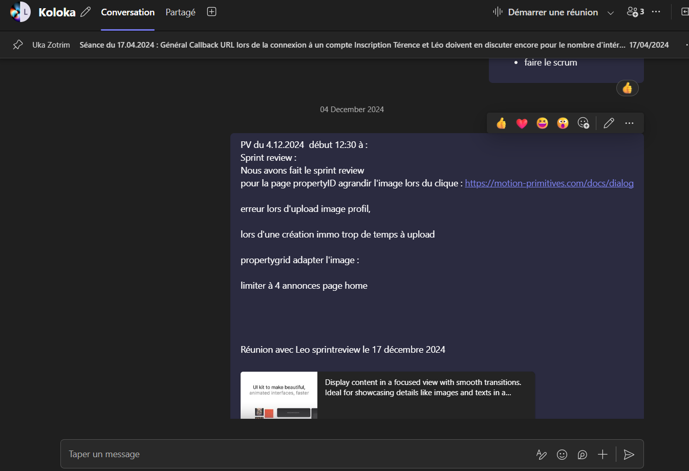 - Koloka : J'ai mis en place des outils de communication pour structurer et coordonner l'équipe, notamment en organisant des sprint reviews, des réunions d'équipe, et en planifiant les sprints dans l'agenda avec des invitations aux membres. Ces actions montrent ma capacité à structurer et à appliquer une stratégie de communication efficace au sein du projet.