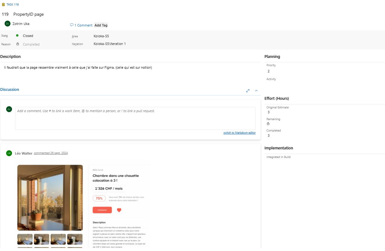 - Koloka : Participation aux réunions d'équipe avec Léo et Joiakim pour clarifier les objectifs du sprint, organiser les sprint reviews et synchroniser les tâches à travers DevAzure. Ces échanges ont permis d'améliorer la coordination et de maintenir une transparence sur l'avancement du projet. Organisation des réunions avec le Product Owner pour présenter l'avancement, recueillir des retours et ajuster le projet selon les attentes du client.