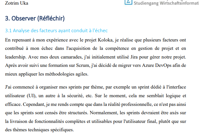 - Koloka : J'ai analysé et tiré des leçons des erreurs rencontrées, comme les problèmes de compatibilité avec les fichiers .env, en trouvant des solutions durables (reclonage du projet). J'ai aussi capitalisé sur les succès, comme l'intégration de DialogTrigger, pour améliorer continuellement le projet et guider l'équipe vers de meilleurs résultats.
