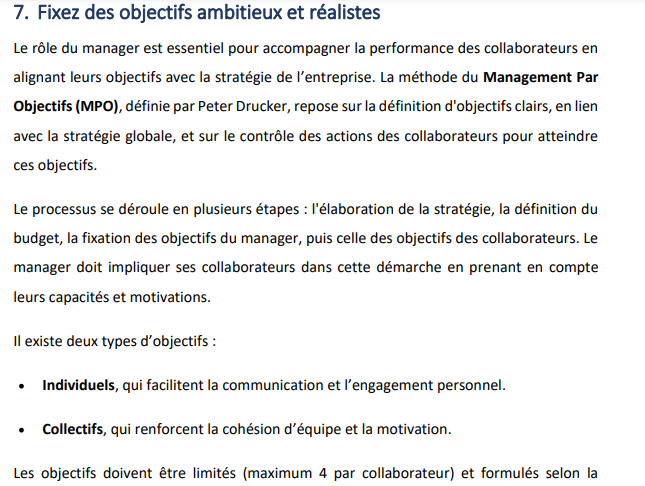 - LI 1 : Dans ce livre, l’auteur souligne l'importance de fixer des objectifs clairs et motivants pour l’équipe. Il recommande l’utilisation de techniques comme les objectifs SMART pour assurer une motivation continue. De plus, il aborde la gestion du stress et des émotions dans un environnement de travail, en mettant l’accent sur la régulation émotionnelle et la gestion des tensions, ce qui correspond directement à la sous-compétence liée à la gestion des émotions et des objectifs.