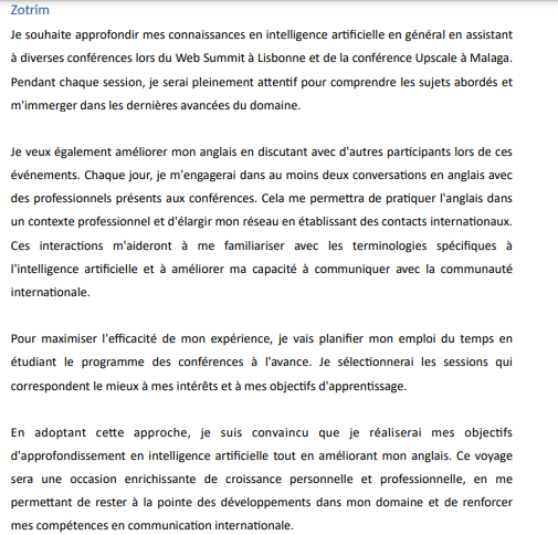- VA : En définissant les objectifs SMART avant le VA, j’ai structuré mes attentes pour maximiser mes apprentissages. Pendant le voyage, j’ai géré efficacement les défis logistiques (comme les paiements, réservations et la coordination) tout en restant concentré sur les conférences, ce qui m’a permis de traiter le stress lié à la gestion simultanée des tâches organisationnelles et des objectifs professionnels.